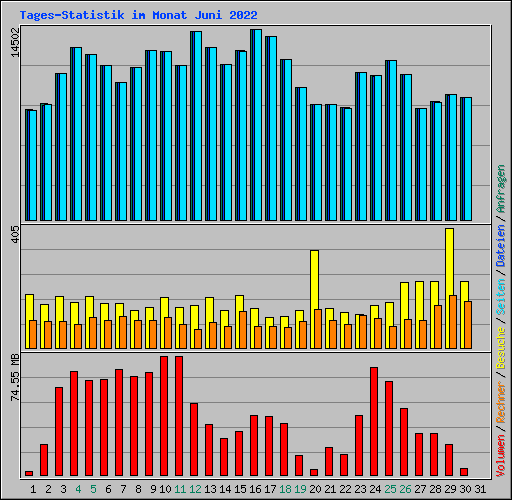 | Tag | Anfragen | Dateien | Seiten | Besuche | Rechner | Volumen | ||||||